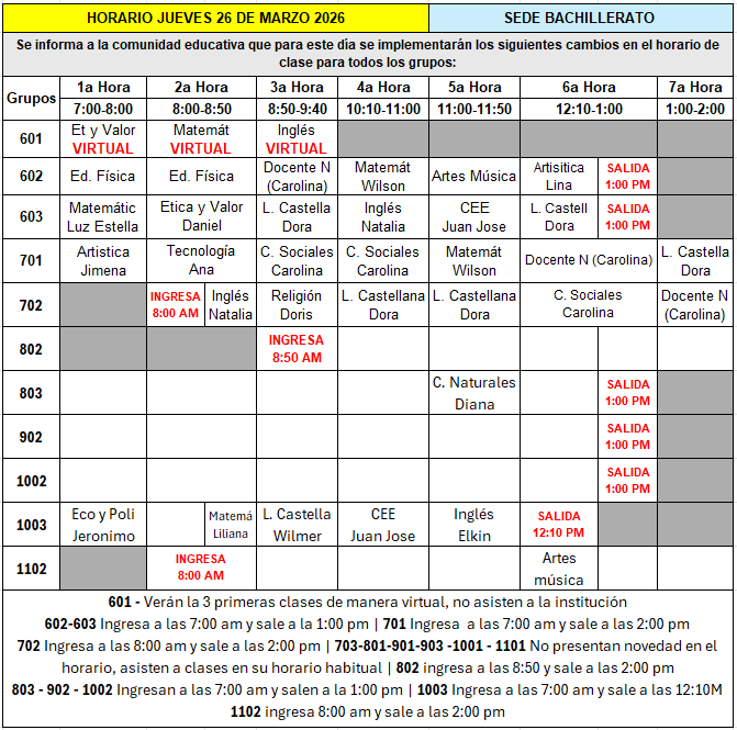 A partir del Lunes 6 de abril: HORARIO DEFINITIVO BACHILLERATO 2026 - JORNADA ÚNICA