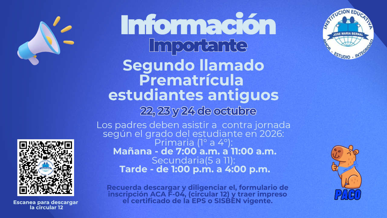 Damos a conocer el formato COM-F03 2025 USUARIOS PAE CON COMUNICADO Si ustedes padres, acudientes y estudiantes requieren ser beneficiarios del programa y se COMPROMETEN con la permanencia en el programa, la buena utilización de los recursos, cumplimiento con las normadel programa, y la adecuada a disposición de los residuos, así como a recibir SIEMPRE los productos de alimentación y CONSUMIRLO EN LA INSTITUCIÓN. Por favor bajar el archivo, imprimir, diligenciar y entregar a los docentes Harvey Correa (aula 203 estudiantes de la mañana) y a docente Tere Mira (aula 201 estudiantes de la jornada de la tarde). A MÁS TARDAR EL Viernes 31 de enero de 2025 1:00 p.m.